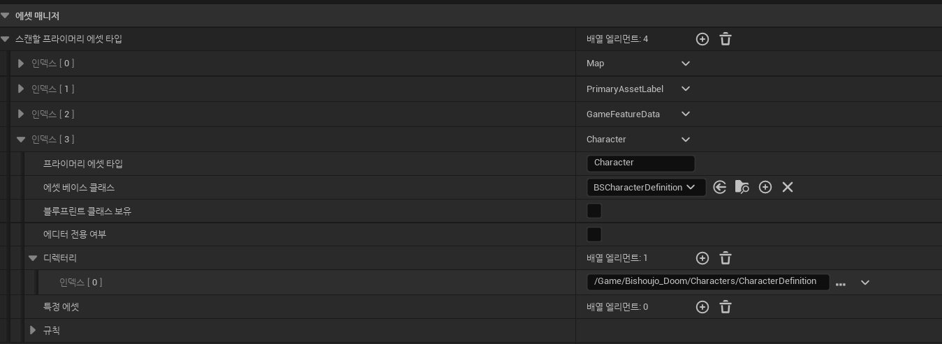 - 예제를 보면 UBSCharacterDefinition 은 PrimaryAsset, 멤버 변수는 SecondaryAsset 이다.